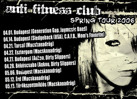 2006. április 1-jén, szombaton, indul az Anti Fitness Club (skate/poppunk) kisebb tavaszi turnéja. Az első állomás Budapesten a Művész Bázisban lesz. További fellépők a Generation Gap és a Joymusic Band. Kezdés 20.00-kor, belépő 550 ft. A koncerten új AFC-s pólót is lehet vásárolni. A turné többi dátuma a szórólapon található. Mindenkit szeretettel várunk a koncertekre!