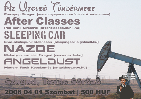 2006. április 1-én, azaz most szombaton, a szegedi Texas sörözőben kerül sor egy popos, punkos, metálos hangversenyre. Meghívott vendégek: Sleeping Car (Debrecen) emo-skatepunk, After Classes (Gyula) poppunk, Angeldust (Kecskemét) modern rokk; hazai részről pedig az Utolsó Tündérmese - emopop - és a Nazde - melodycore-metal. Minden bulizni várót nagy szeretettel várunk, a koncertek után buli hajnalig, kezdés 20.00-kor, belépő 500 forint.