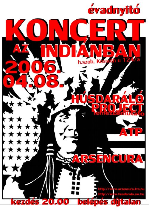 Több mint féléves kényszerű szünet után ismét koncert az Indiánban (Hajdúszoboszló, Kossuth u. 124). 2006. április 8-án megtörjük a csendet és újra metáltól lesz hangos a környék. Ezen a jeles napon megtisztel minket jelenlétével és egy fergeteges lemezbemutató hörgés-morgással a Húsdaráló Project (Debrecen, Kergemarha-core). Az este folyamán fellép továbbá az ATP (Földes, numetal) és a helyi színek képviseletében az Arsencura (metal-core) zenekar. Kezdés 20.00 óra, a belépés természetesen díjtalan.