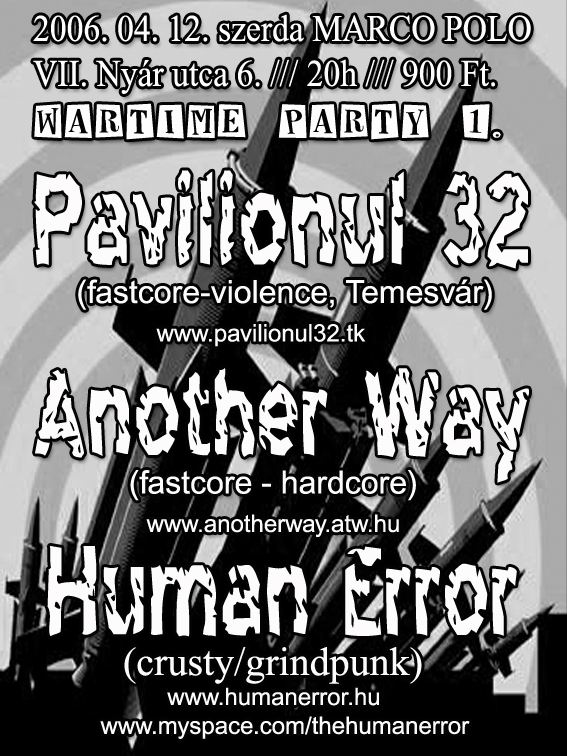 2006. április 12-én, szerdán este a gyors és erőteljes hardcorepunk rajongóira kihagyhatatlan móka vár a Marco Polo klubban (Budapest, Nyár utca 6.). A Pavilionul 32 egy őrült fastcore banda Temesvárról, Charles Bronson, Bingo, Betercore híveknek tuti befutó. Jelenleg a békési Another Way-el turnéznak, akik szintén ultragyors hc-ban utaznak, az új lemezük nemrég jött ki. A helyi support ezúttal a Human Error lesz, akik minden bizonnyal a tőlük megszokott nyers crusty/grind cuccot nyomják majd. Kezdés 20.00-kor, a belépő 900 Ft.