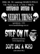 2006. április 30-án a mélyre hangolt, nyers és kegyetlen grindcore hívei örülhetnek a cseh Needful Things budapesti bulijának. A banda már hosszú évek óta sikeresen zajong Európa szerte, az új nagylemezük, a Dead Point pedig nemrég jelent meg a Khaaranus production gondozásában, ahol olyan bandák vannak még, mint a Cerebral Turbulency, Poppy Seed Grinder, Alienation Mental satöbbi. Az egyik legaktívabb magyar HC banda kétségkívül a Step On It, sajátos all school muzsikájukban találkozik a régi és a modern hardcore minden pozitívuma. Fellép még a csepeli Don’t Say a Word, akik korábban SFA néven játszottak. Ők old school hardcoret nyomnak. Kezdés 20.00-kor, a belépő 900 Ft. Helyszín itt is a Marco Polo klub (Budapest, Nyár utca 6.).