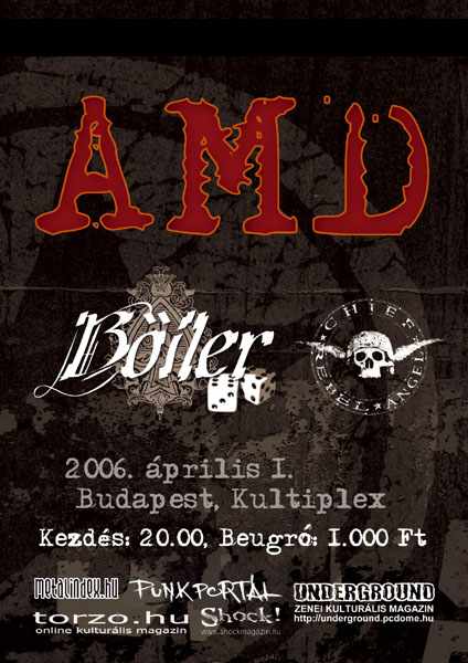 Nem hinném, hogy bárkinek is be kellene mutatni az AMD zenekart. Remek lehetőség a mai fiatalságnak, hogy élőben élvezhessék Magyarország punk-hardcore színterének, egyik legmeghatározóbb zenekarát újra élőben. Előttük fellép még a Böiler, valamint a Chief Rebel Angel. Kezdés 20.00-kor, a belépő pedig csak 1000 ft.