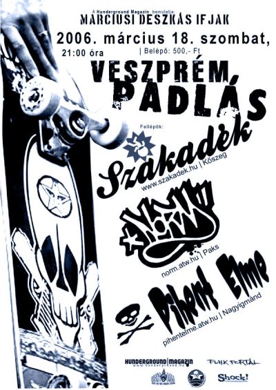 Aki 2006. március 18-án ellátogat Veszprémben a Padlásra, annak egy jó kis pörgős, táncos, itt-ott zúzós buliban lehet része, hiszen aznap este játszani fog a kőszegi illetőségű, de Budapestre igazolt Szakadék, a paksi atomgyerekekből verbuválódott Norm és a kisközségek büszkesége, a nagyigmándi Pihent Elme - ami garantált a jó szórakozásra. Bővebben...