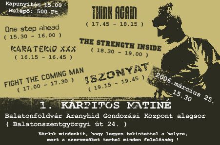 2006. március 25-én kerül megrendezésre az első Kárpitos matiné a balatonföldvári Aranyhíd Gondozási Központ (Balatonszentgyörgyi út 24. volt kárpitos üdülő) alagsorában, ami jelenleg a Think Again és Csirkepogó zenekarok próbaterme. A koncert 15.30-tól pontosan 19.45-ig fog tartani, így mindenki eléri az utolsó vonatokat Budapestig és Nagykanizsáig is. A fellépő zenekarok nagy részét szerintem nem kell bemutatni. 15.30-tól Ones Step Ahead (fiatal old school hardcore Pusztaszabolcsról) 16.15-től Karatekid (straight youth crew, ez lesz az első új felállású koncertjük) 17.00-től Fight the Coming Man (dallamos hardcore Székesfehérvárról) 17.45-től Think Again (helyi old school hardcore) 18.30-tól Strength Inside (straight edge youth crew, Mezőtúr) 19.15-től Iszonyat (Bakony street-punk). A belépő 500 ft lesz.