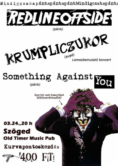 A 2006. március 24-i szegedi Redlineoffside, Krumpliczukor, Something Against You buli a Szeged Városi Rock Klub sajnálatos márc. 21-i bezárása miatt a szegedi Old Timer Music Pubban lesz megtartva. A kezdés 20.00 órára változott, mert 22.00-kor be kell, hogy fejeződjenek a koncertek, ezért gyertek időben! A belépő 400 ft lesz.