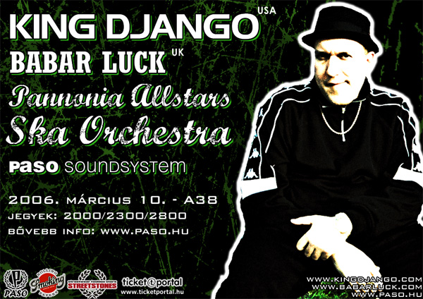 Reggae-dancehall, világzene és ska-klezmer egy new york-i énekestől és zenekarától, anarcho reggae egy pakisztáni származású angol muszlimtól, valamint magyar ska-reggae a budapesti ska hangulat megfestőitől - más szavakkal: King Django (USA), Babar Luck (UK) és a Pannonia Allstars Ska Orchestra az A38 állóhajón, 2006. március 10-én! Bővebben...