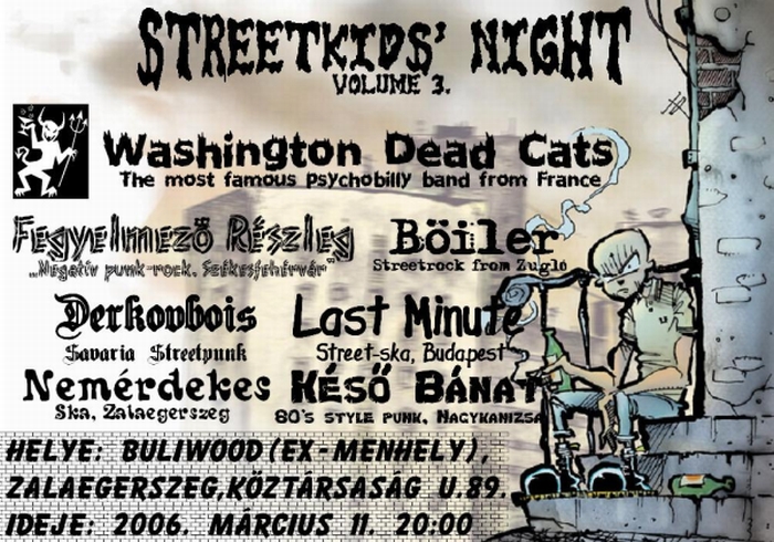 2006. március 11-én egy iszonyatosan jó buliba csöppenhetnek azok, akik ellátogatnak Zalaegerszegre, a Buliwood Music Pubba (Köztársaság u. 89.). A városban ugyanis harmadszorra kerül megrendezésre a Streetkids’ Night névre hallgató koncertsorozat. Az est fellépői ezúttal a nagykanizsai Késő Bánat, akik a 80-as évek punkzenekarainak hangzásvilágát követik, a hazai pályán fellépő ska-zenekar, a Nemérdekes, a székesfehérvári Fegyelmező Részleg, akiket nem hiszem, hogy be kellene mutatni a nagyérdeműnek, a szombathelyi streetpunk fenegyerekei, azaz a Derkovbois, akik már a Streetkids’ Night-ok oszlopos tagjainak tekinthetők, hiszen eddig mindegyik buliban tiszteletüket tették. Rajtuk kívül még a budapesti street-ska képviselői, az új felállással színpadra lépő Last Minute, a „mucsai Cock Sparrer” Böiler Zugló szívéből, és végül az est megkoronázásaként, magyarországi miniturnéjuk utolsó állomásaként a francia Washington Dead Cats ad koncertet. A koncert kezdete pontban 20.00 óra, a belépés ellenértéke 1200 ft.