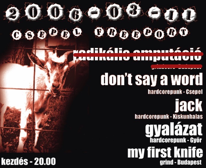 A szélsőségesebb zenék kedvelői igazi zúzást kaphatnak az arcukba, ha ellátogatnak a csepeli Freeport klubba. Most szombaton lesz egy elég darálós buli, a következő bandákkal: My First Knife, Jack, Gyalázat, Don't Say A Word. A My First Knife egy pesti illetőségű grind banda, két énekessel nyomulnak, iszonyatos pitch shifteres énekkel, hörgéssel őrjítik meg a nagyérdeműt. A Gyalázatot igazából nem kell bemutatni, egyre több helyen bukkannak fel és tolják az üvöltözős fasza hcpunkot Győrből. Ellátogat még a kiskunhalasi Jack zenekar is, zenéjük szélsőséges kalapálós punkzene rengeteg grind cuccal megpakolva. Végül fellép még az SFA-ból alakult csepeli Don't Say A Word, kemény, határozott hardcore-t nyomnak, mindenféle sallang és melléugatás nélkül. A buli 20.00-kor kezdődik 2006. március 11-én a Csepeli Freeportban (Szabadkikötő).
