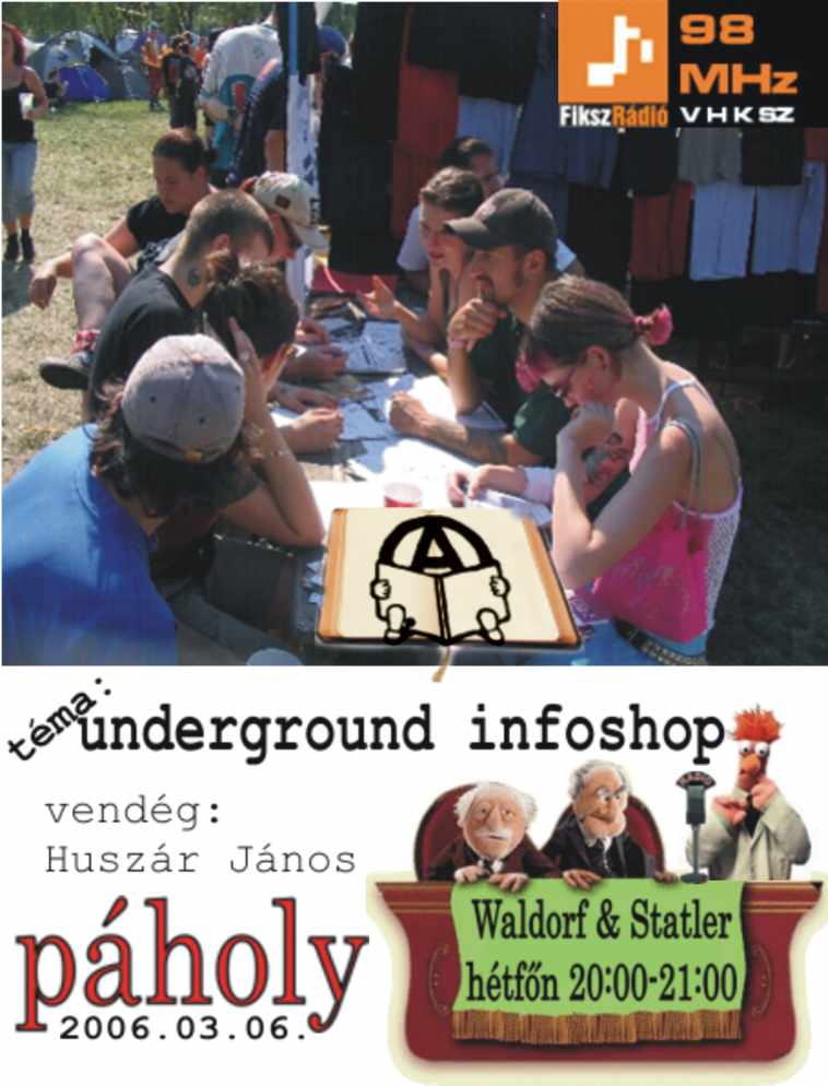 Egyre több underground infoshop (nemArt shop Budapest, Szövetség utca 23.), aktivista klub (AK57 Budapest, Dohány utca 57.), és antikvárium (Gondolkodó Budapest, Logodi utca 51.) várja az érdeklődőket. Ezekben a központokban a független sajtó anyagai mellett különböző jellegű beszélgetések, programok várják az érdeklődőket. A legújabb ilyen jellegű kezdeményezésről beszélgetünk Huszár Jánossal. Meg egy rövid időre szóba kerül a Centrum Csoport Március 3-i tárgyalásának eredménye.