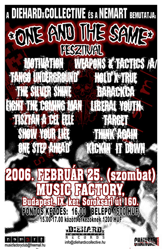 One and the Same fesztivál lesz most szombaton, azaz 2006. február 25-én a Music Factoryban (Budapest, Soroksári út 160.). A fellépők tábora elég népes, többek közt fellép a One Step Ahead, a Show Your Life, a Tisztán a Cél Felé, a Fight the Coming Man, a Silver Shine, a Tango Underground, a Motivation, a Weapons and Tactics (A), a Hold X True, a Barackca, a Liberath Youth, a Target, a Think Again és végül de nem utolsó sorban a Kickin it Down. A buli 16.00-kor kezdődik, a belépő pedig 1500 ft. Aki 15.00 és 17.00 között érkezik, annak csak 1200 ft.