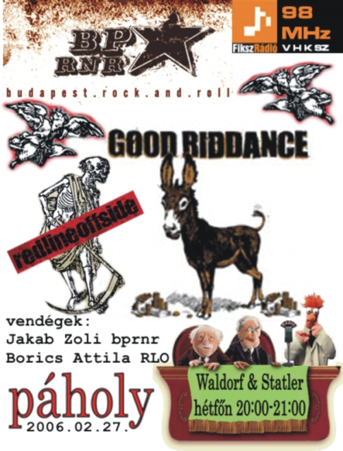 A 2006. február 27-ei Páholy adásban szó lesz a Budapest Rock ' N ' Roll által szervezett 2006. március 2.-i Good Riddance és Red Line Offside buliról. Ennek kapcsán beszélgetünk a BPRNR-ról és a két zenekarról. Vendégeink: Jakab Zoli (BPRNR), Borics Attila (RLO).