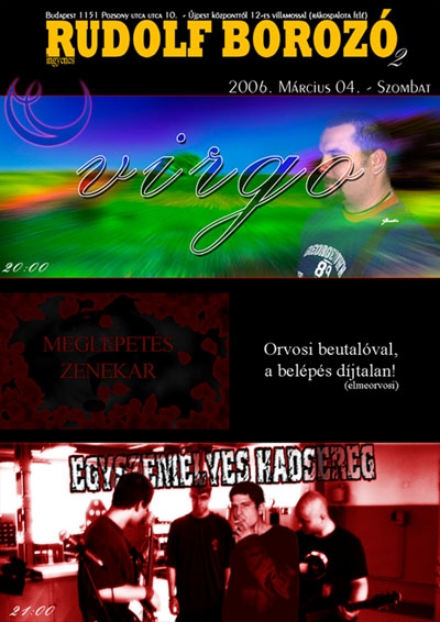 Aki a közelben lakik, vagy nem nőtt rá a seggére a fotel és van kedve, nézzen le a rákospalotai Rudolf borozóba (XV. ker.), úgy 2006. március 4-én, szombaton, este 7-8 óra körül! Fellép a Virgo, az Egyszemélyes Hadsereg, plusz még egy zenekar (legyen meglepetés). Ezek után zene szalagról (v. inkább cd-ről) és piálás reggelig! A közelben éjszakai járat, valamivel messzebb pedig kórház. A produkció megtekintése ingyenes!