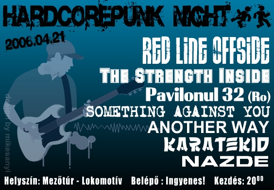 2006. április 21 -én ismét egy vérbeli mezőtúri hardcore-punk koncertet láthatunk a Lokomotívban! Aki volt már itt koncerten, tudja, milyen felejthetetlen bulik vannak itt a zenekarok és a hangulat szempontjából is! Reméljük, ez az eddigieknél is emlékezetesebb lesz, már a 7 fellépő miatt is, természetesen ismét ingyen! Az est főbandája a mostantól remélhetőleg újra rendszeresen koncertező Red Line Offside lesz. A szintén fellépő, egyre többet külföldre járó fastcore Another Waynek köszönhetően először játszik nálunk a román Pavilonul 32 punk-hardcore zenekar. Fellép továbbá a helyi, egyre ismertebb Strength Inside, a budapesti Something Against You, az új felállással beinduló straight edge Karate Kid, és a fiatal szegedi Nazde. Kezdés 20.00-kor, a belépés szokás szerint ingyenes, és a hely nyitva van az első vonat indulásáig!
