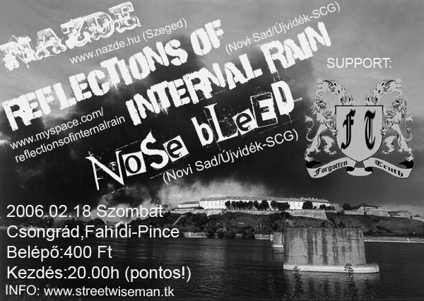 2006. február 18-án, szombaton, a csongrádi Fahídi Pince-ben hardcore est lesz a szerbiai Reflections Of Internal Rain, a szintén szerb Nose Bleed és a szegedi Nazde közreműködésével. Belépő 400 ft lesz, a kezdés pedig szigorúan 20.00-kor, mert így még a vidékiek is el fogják érni az utolsó buszt. További részletek és netes elérhetőségek a szórólapon.