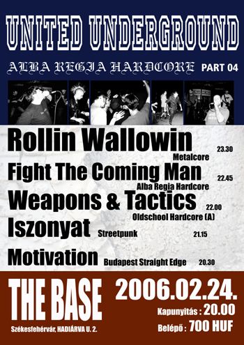 Meglehetősen zúzós bulin vehet részt az, aki most pénteken, 2006. február 24-én ellátogat Székesfehérvárra, a Base-be, ugyanis olyan fasza punk és hardcore zenekarok fogják ott szórakoztatni a nagyérdeműt, mint az Iszonyat Tapolcáról, a hazai pályán fellépő Fight The Coming Man, az osztrák Weapons & Tactics, a Rolling Wallowin és a Motivation Budapestről, akiknek ez lesz a bemutatkozó bulijuk. A belépő 700 pengő, további részletek a szórólapon!