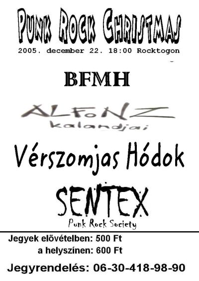 Jó kis punk koncert kerül megrendezésre csütörtökön. A Punk/Rock Christmas nevű rendezvény, december 22-én lesz a Rocktogonban. Fellépők: SPM (kalifornia punk), Vérszomjas hódok (rock), Alfonz kalandjai (punk), Sentex (punk). Mindenkit szeretettel várunk! Beugró: 600 Ft