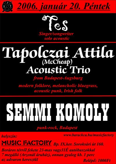Talopczai Attila [Hatóságilag Tilos!] Ausburgban új akusztikus triót hozott össze, amit a modern folklór, a punk, és az Ír népzene jellemez. Az x-art projekt segítségével, ezzel a különleges produkciójával látogat el 2006. január 20-án, a budapesti Music Facktory-ba. Az est másik akusztikus fellépője Tes a holland lány, akit már hallhattatok a Fiksz Rádióban és láthattatok a Sziget 2005 Zöld Udvar színpadán. Tes akusztikus gitárja kíséretében olyan témákat boncolgat, mint a párkapcsolat, a szőrmeipar, a globalizáció. Az est egyetlen elektronikus csapata a Semmi Komoly, akik nem rég ünnepelték 8. éves szülinapjukat