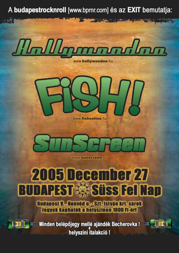 A Hollywoodoo második, „Karmolok, harapok” c. lemezével szétturnézta a nyarat, most tiszteletüket teszik a Süsiben is, ahol új basszusgitárosuk bemutatkozásának lehetünk tanúi. A brigád új számokat csűr-csavar, februárban pedig új klippel jelentkezik. A jelenleg is stúdióban ügyködő Fish! évek óta állandó szereplője a budapesti klubéletnek, az év végi bulit az első nagylemez követi majd januárban, a műsor is erre az anyagra épül, természetesen az elmaradhatatlan régi slágerek mellett. Az est vendége a soproni garázsrock/funkpunk Sunscreen, akik ismerősek lehetnek a VIVA tehetségkutatójáról is, ha meg nem, akkor most igen.