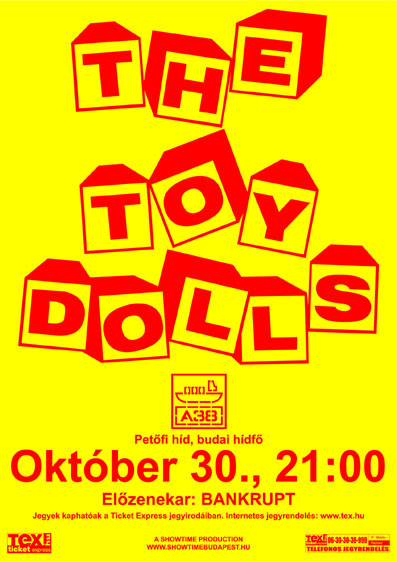 1998 után újra Magyarországon játszik a The Toy Dolls! Az 1979-ben alakult legendás punkzenekart azt hiszem, senkinek nem kell bemutatni. Számtalan album és koncert áll a hátuk mögött, és most újra megmutatják nekünk, mit tudnak. Remélhetőleg hallhatunk majd pár új számot a hamarosan megjelenő Our Last Album? című lemezről is. Európai turnéjuk budapesti állomása október 30-án, a budapesti A38 állóhajón lesz. Előzenekar a budapesti dallamos punk-rockban utazó Bankrupt zenekar. Belépő elővételben 4900 Ft-ért kapható a Ticket Express jegyirodákban.