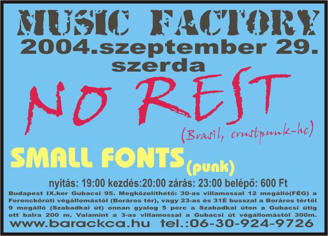 A Music Factory-ba is elérkezett a Brazil hullám! Most egész Európát jobbnál jobb Brazil zenekarok árasztják el, nekünk is sikerült elcsípni egyet. A No Rest hardcore-punk zenekar némi crust beütéssel szeptember 29-én, szerdán lesz látható. Már július vége óta róják a kilométereket egész Európában. Több ízben is jártak már ezen a kontinensen, és népszerűségük is már elég nagy, amit többek között a tömör és jól megszerkesztett zenéjüknek, a politikai beállítottságuknak és a kicsit érces, de kellemes női énekhangnak is köszönhetnek. Előttük a small fonts nevű fiatal punk, néha ska elemekkel tűzdelt könnyedebb zenét játszó banda igyekszik bemelegíteni a hangulatot. Most voltak stúdióban, tehát lehet, hogy hamarosan otthon is meglehet majd hallgatni a muzsikájukat.