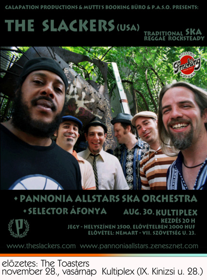Senki ne felejtse el, hogy 30-án, hétfőn a budapesti Kultiplex színpadán lép fel az amerikai tradicionális ska egyik vezető zenekara, a Slackers. Előzenekar a Pannonia Allstars Ska Orchestra, a koncertek után Selector Áfonya pakolja a lemezeket. Jegy elővételben kapható a Nemart és Wave lemezboltokban 2000 Ft-os áron, a helyszínen 2500 Ft a beugró.