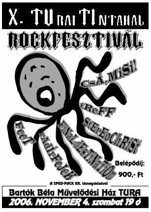 2006. november 4-én, szombaton újra megrendezésre kerül Turán a Tintahal Rockfeszt. Találkozhatunk a F.E.E.T. zenekarral, akik modern rock / metal zenéjükkel kápráztatnak majd el minket. A Radírfejek nevű zenekarról sajnos nem tudtunk szerezni semmilyen információt, s addig nem is merjük kitalálni, milyen zenét hordozhat ez a név. A Final Destination az általuk fémjelzett modern gothic / screamo / hardcore muzsikát próbálják majd prezentálni. Az alternatív muzsikát játszó Csá Misi! nevű fomáció már számos neves együttessel is játszott egy színpadon, valószínűleg hozzák majd a színvonalat, ahogyan ez a stílus megkívánja, s végül, a Stereochrist legénysége fog a húrok közé csapni, akik a volt Mood zenekar poraiból alakultak, s már évek óta a magyar metal undergroundban nyomulnak.