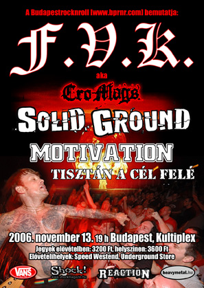 Úgy látszik 2006 nagyszerű év a klasszikus hardcore kedvelőinek, hiszen fél éven belül másodszor köszönthetjük hazánkban a Fearless Vampire Killers formációt, de talán nevezzük ezt nyugodtan Cro-Mags néven inkább. John Joseph énekes és Mackie dobos ezúttal szintén nagyágyúkkal érkezik, hiszen ki ne ismerné Tom Capone nevét, aki korábban többek között a legendás Bold tagja volt. Cache Tolman pedig a Rival Schools, a Civ és az Iceburn soraiban pengetett. Mondani se kell, az FVK programját az Age Of Quarrel számai, valamint Bad Brains feldolgozások teszik ki.