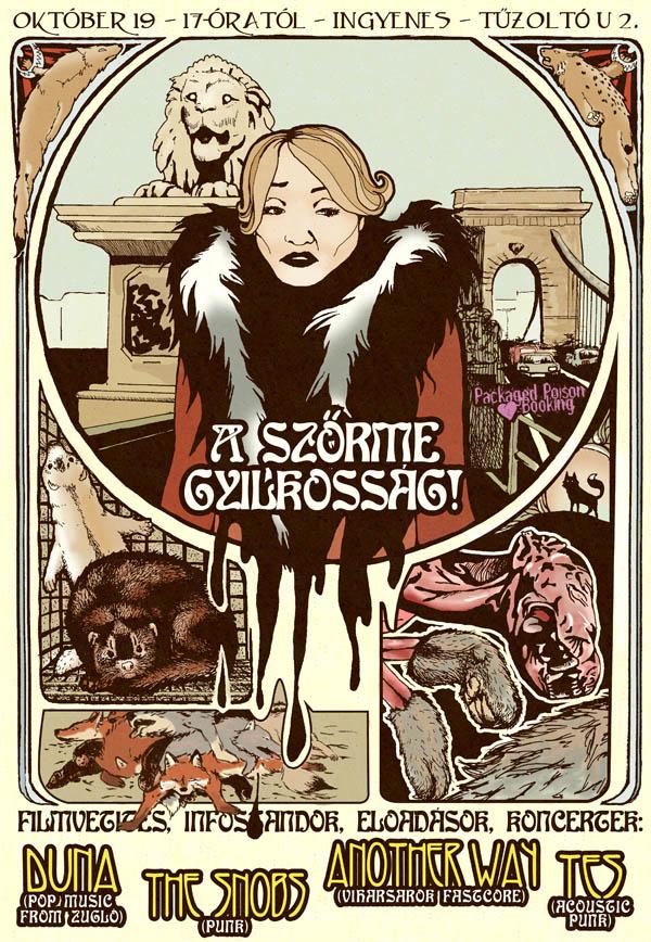 Lehetőséged nyílik arra, hogy informálódj a témában és hozzájárulj a küszöbön álló Szörme Ellenes Kapmányhoz. A rendezvény 17.00-kor kezdődik. Lesznek zenekarok, vegán konyha, filmek és információs standok a szörméről és egyéb állat jogi problémákról. Ha nem tudsz jönni, de szeretnél részese lenni a Szörme Ellenes Kampánynak, vedd fel velünk a kapcsolatot: szorme-ellen@hotmail.com.
