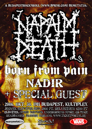 A Napalm supportja a teljes turnén hollandia első számú metalcore exportja, a Born From Pain lesz. Idén már láthattuk Őket itthon a Hegyalja Fesztiválon, de ezúttal az igazi terepükön, egy klubbulin köszönthetjük Őket. Új lemezük november végén "War" címmel jelenik meg a Meatl Balde gondozásásban. Hazai részről pedig a Nadir fogja szórni az igét a koncerten. Öszesen 400 db belépő áll rendelkezésre, ami gyaníthatóan elkel, úgyhogy mindenkinek javasoljuk jegyét vásárolja meg elővételben!