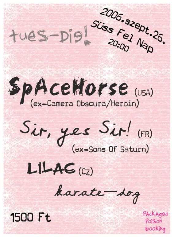 A kaliforniai post-hardcore zenekar, a Spacehorse igazán szép múltú tagokból alakult. Matt Anderson (dob) az underground Gravity Records 1989-es alapításával és korábbi zenekaraival (Heroin, Rice) megteremtette az úgynevezett "San Diego hangzást", ami hatalmas befolyással volt a mai független zenére. Russel White (ének) korábbi és párhuzamos zenekaraival (Shortwave Channel, Camera Obscura, Champagnekiss) számos turnéja alkalmával olyan zenekarokkal osztotta meg a színpadot mint a Fugazi, Blonde Redhead, Rocket From The Crypt. Scott Bartilonni pedig (ex-Heroin/Clikatat Ikatowi) egyike napjaink legjobb punk/hardcore gitárosainak.