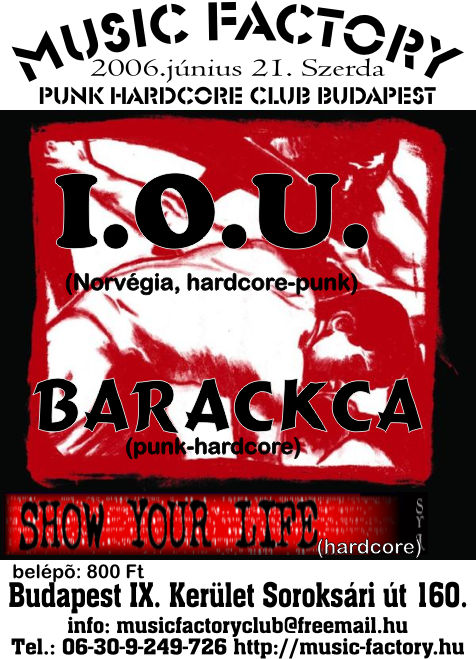 Aki volt 2002-ben a néhai Nemart klub-ban a Kids Like Us koncertjén az tudja, hogy milyen őrült jó koncertre számíthat, mert igaz a zenekar a turné után feloszlott, de néhányan a Crash és a The Union Policy tagjaival közösen létrehozták az egyik legfagyosabb oldschool hardcore bandát az I.O.U.-t. Zenéjükkel a műfaj öregjeit követik: Negative Approach, Minor Threat, Los Crudos, Black Flag, Tragedy stb. Hallgasd meg a számaikat itt: http://www.myspace.com/iou.