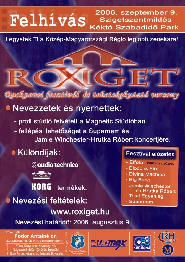 Idén már második ízben kerül megrendezésre Szigetszentmiklóson a rock zene kedvelőinek nagy örömére a Roxiget – Rockzenei fesztivál és tehetségkutató verseny. A rendezvény a Közép-Magyarországi Régió amatőr rock zenekarai számára nemcsak fellépési lehetőséget, hanem igazi megmérettetést kínál a szakmai zsűri, valamint a rockzenére igényes, érdeklődők előtt. A jelentkező együttesek 2006. augusztus 9-ig nevezhetnek a szigetszentmiklósi Városi Könyvtár és Közösségi Háznak eljuttatott demo anyaggal. A győztes zenekar a Magnetic Stúdió által profi stúdiófelvételt nyer, valamint további díjként fellépési lehetőség nyerhető Jamie Winchester és Hrutka Róbert zenekara valamint a Supernem együttes egy budapesti koncertje előtt. Több különdíj is átadásra kerül majd szponzori felajánlásokból. A demok alapján előzsűrizés útján kiválasztott 5 legjobb együttes mutatkozik be élőben a szeptember 9-i döntőn. Az amatőr zenekarok versengése, után a fesztivál hangulatát a csepel-szigeti rock zenekarok mellett két „főzenekar” fellépése teszi teljessé: A tavalyi verseny győztese az Effeta (shuffle-beat) lép elsőként színpadra, majd őket követik a Divina Machina (blues rock), a Big-Bang (Thin Lizzy Cover Band), a csepeli Blood is Fire (metal-core), majd Jamie Winchester és Hrutka Róbert angolszász rock formációját a Testi Egyenleg Ska Kollektíva váltja fel, végezetül pedig a Supernem zenekart hallhatja Kéktó közönsége. A fesztivál fővédnöke Fodor Antalné dr., Szigetszentmiklós polgármestere.