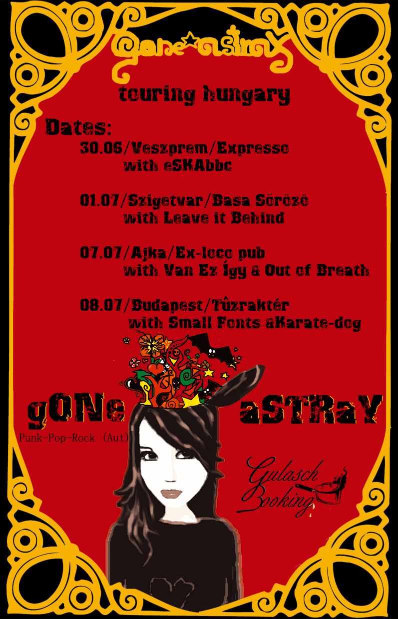 Nemsokára hazánkba látogat a Gone Astray dallamos emo-punk/rock-ot játszó zenekar Ausztriából. A zenekar tagjait három lány es egy srác alkotja (a srác a The Plague Mass gitárosa is egyben). Ausztriát már végig koncertezték és nagyon pozitív visszajelzések érkeztek. Most készült el a demojuk, amit a mini turné keretein belül a magyar közönségnek is be szeretnének mutatni (kritika a demo-ról - http://punkportal.hu/article.php?id=687).