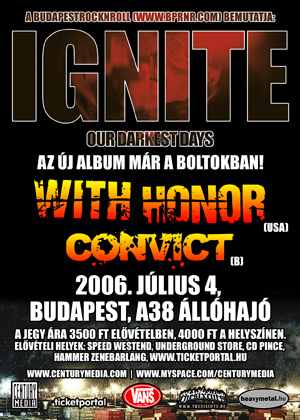 2006. július 4-én újra klubbulin köszönthetjük a kaliforniai (és énekese révén ugyebár egy kicsit magyar!) Ignite-ot. Nem hisszük, hogy felesleges lenne szaporítani a szót, hiszen kis hazánkban nincs olyan kemény zenét kedvelő, aki hol itt, hol ott már ne találkozott volna a dallamos hardcore zenekarral az elmúlt 10 évben. Új lemezükkel, az Our Darkest Days című albummal a világ hardcore színterének élvonalába visszatérő zenekar európai lemezbemutató körútjának július 4-i állomása a budapesti koncert.