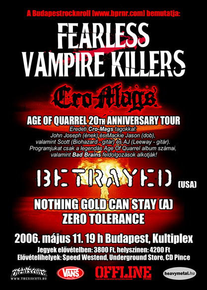 2006. május 11-én a hazánkat pár éve már meglátogató Cro-Mags másik fele veszi birtokba a Kultiplex színpadát, és ugyan az örökös Harley Flanagan – John Joseph harc, nyilatkozathadjárat még 2006-ban, legendás lemezük, az Age Of Quarrel 20 éves jubileumának évében is aktuális, nyugodtan nevezzük csak történelminek a tényt, hogy John Joseph (Cro-Mags énekes) és Mackie Jason (Cro-Mags dobos), kiegészülve Scott Roberts Biohazard gitárossal és AJ Novello-val (Leeway!) basszusgitáron ellátogat hazánkba, mégha Fearless Vampire Killers néven teszik mindezt (a Cro-Mags nevet a fent említett Joseph – Flanagan vita folytán nem használhatják egyértelműen). A fanatikusok vallják csak be, jó lesz minden idők egyik legmeghatározóbb New York Hardcore frontemberét élőben látni, valamint hallani, hogy az F.V.K. programját egy pár Bad Brains feldolgozástól eltekintve (érdekesség: John Joseph a Bad Brains roadja volt, Bloodclot becenéven „futott”, és ma van is egy zenekara Bloodclot néven) a Cro-Mags alapmű Age Of Quarrel számai teszik ki. Az abszolút fanatikusok ennek talán még jobban örülhetnek, hiszen vita ide, vita oda, Flanagan igen gyenge próbálkozása, a Revenge néven kiadott Cro-Mags album a 90-es évek derekán igencsak megtépázta sokak elsőszámú hardcore zenekarának renoméját. Szóval, amíg az állandó viták egy teljes reunion-t ellehetetlenítenek, addig mi legyünk annyira önzőek, hogy örülünk annak is, ha legalább hiteles köntösben hallhatjuk a klasszikusokat.