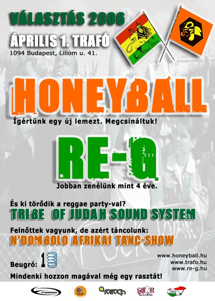 A Honeyball idén először, a budapesti Trafóban lép színpadra 2006 április 1-én, a remek Re-G zenekarral. Várnak mindenkit a Tűzoltó és a Liliom utca sarkán, ahol az N'Dombolo jóvoltából lesz afrikai tánctanítás és óriási afro show, a Tribe of Judah Sound System pedig akkora zenéket pakol majd, hogy csak na!