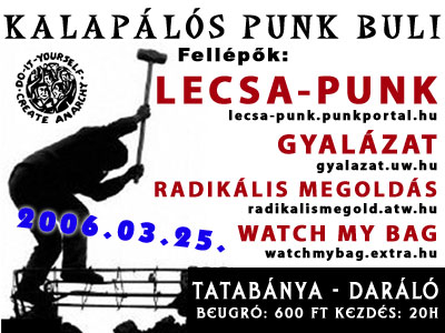 2006. március 25-én kerül megrendezésre az első Kárpitos matiné a balatonföldvári Aranyhíd Gondozási Központ (Balatonszentgyörgyi út 24. volt kárpitos üdülő) alagsorában, ami jelenleg a Think Again és Csirkepogó zenekarok próbaterme. A koncert 15.30-tól pontosan 19.45-ig fog tartani, így mindenki eléri az utolsó vonatokat Budapestig és Nagykanizsáig is. A fellépő zenekarok nagy részét szerintem nem kell bemutatni. 15.30-tól Ones Step Ahead (fiatal old school hardcore Pusztaszabolcsról) 16.15-től Karatekid (straight youth crew, ez lesz az első új felállású koncertjük) 17.00-től Fight the Coming Man (dallamos hardcore Székesfehérvárról) 17.45-től Think Again (helyi old school hardcore) 18.30-tól Strength Inside (straight edge youth crew, Mezőtúr) 19.15-től Iszonyat (Bakony street-punk). A belépő 500 ft lesz.