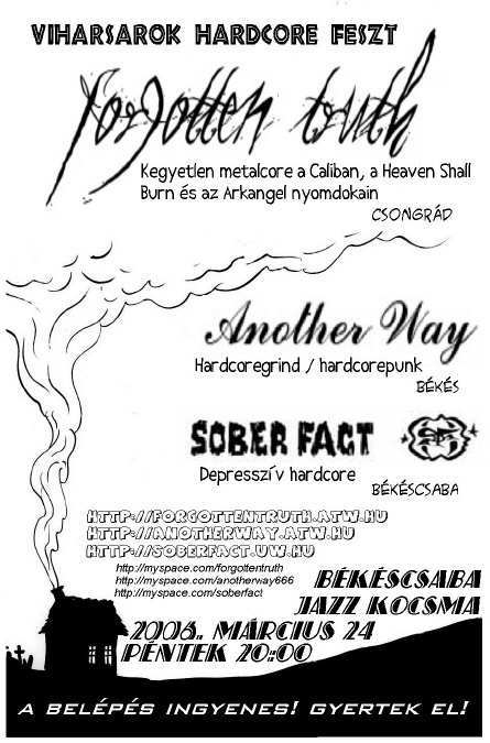 2006. március 24-én, pénteken Békéscsabán a Jazz Kocsmában (Luther u.) 20.00-tól fellép a Sober Fact (depresszív HC - Békéscsaba), az Another Way (hardcorepunk - Békés) és a Forgotten Truth (brutális metalcore Caliban, Heaven Shall Burn, Arkangel vonalon - Csongrád). Gyertek pusztítani minél többen! Pontos kezdés várható!