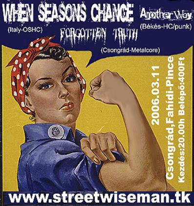 2006. március 11-én, azaz holnap valódi vidéki hardcore csemegére látogathatnak el az érdeklődők. Csongrádon, a Fahíd Pince borozóban lép fel az olasz oldschool hardcore banda, a When Seasons Change, a csongrádi metalcore Forgotten Truth és Békés megyei fastcore mesterei, az Another Way. A buli az utolsó buszokig tart, így mindenki időben haza tud jutni! Gyertek sokan!