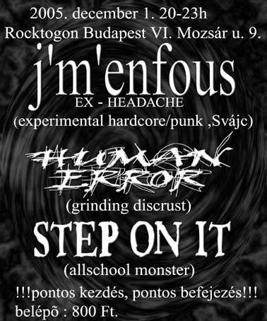 2005. december 1-én egy valóban nem mindennapi nemzetközi banda jön el hozzánk budapestre, a Rocktogonba. És ez nem más banda, mint a svájci székhelyű J`m`en Fous. A csapat tagjai már rengeteg más zenekarban is zenéltek korábban ezek közül a legismertebb a Headache volt, akik diló, megtekert, agyas, kísérletezős HC-punkot nyomtak. A J`m`en Fous ott folytatja, ahol a Headache abbahagyta. Két basszusgitáros is játszik náluk, szóval senki se számítson átlagos dalszerkezetekre és megoldásokra!