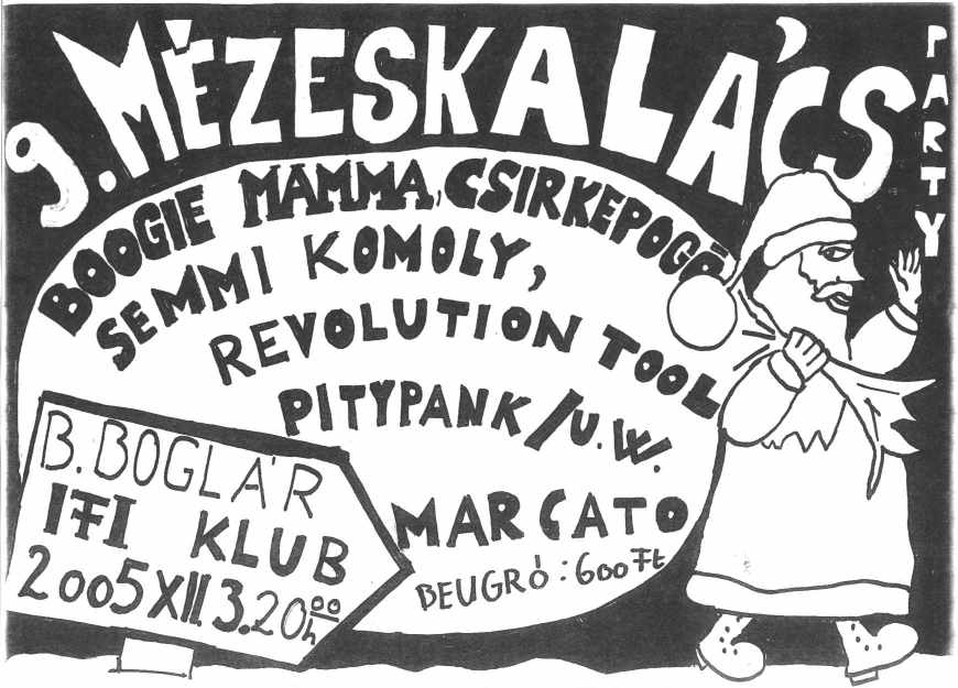 A következő mézeskalács a télapóra várakozás jegyében fog tellni. Télapóval (a konzervativabbak kedvéért Mikulással) való találkozásra felkészülni legideálisabb helyszín a 9. Mézeskalács party. Nem véletlenül: a hatszáz forintos (télapóruhás emberkéknek 300ft-os) belépők mellé szaloncukrot / csokimikulást és az alábbi hat zenekart kapja - mégha csak pár órára is - ajándékba a kedves látogató:Marcato, Pitypank, Csirkepogó, Boogie Mamma, Semmi Komoly, Revolution Tool (A).