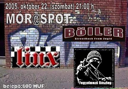 2005. október 22-én Mór városába fog ellátogatni a következő három zenekar: elsőként a tiszafüredi fenegyerekek, a Linx kápráztatja el a publikumot dallamos közönségénekeltetős zenéjével, majd a zuglói srácokból álló Böiler játssza el a már jól ismert számait, majd végül a fehérvári Fegyelmező Részleg zenekar próbálja méltón befejezni a mulatságot. A koncert a Spot nevű szórakozóhelyen kerül megrendezésre és 21.00-tól vehetik birtokba a táncparkettet az odallátogatók 600 ft ellenében. A koncertek után, selectorok híján, hajnalig italozás és kocsmai éneklés.