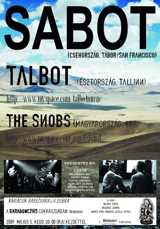 2009. május 5., Garaboncziás, Szeged, és 2009. május 6., Sirály, Budapest: az amerikai származású, Csehországban élő duó alkotta Sabot basszusgitár - dob felállásával különleges és páratlan élményt nyújt az instrumentális jazz/punk/matek-rock, illetve a stílusokon felüli zenék kedvelőinek. Nevük az underground, független színtéren fogalommá vált 21 éves fennállásuk alatt, amely 10 nagylemezüknek, többszöri világ körüli turnéiknak (Kínától Dél-Amerikáig és „Vice Versa”), valamint példátlan kitartásuknak, hozzáállásuknak köszönhető (pl. multikulturális központ működtetése lakóhelyükön, Táborban). 9 év után visszatérnek, hogy megmutassák, mi is a valódi dob és basszus! Bővebben...