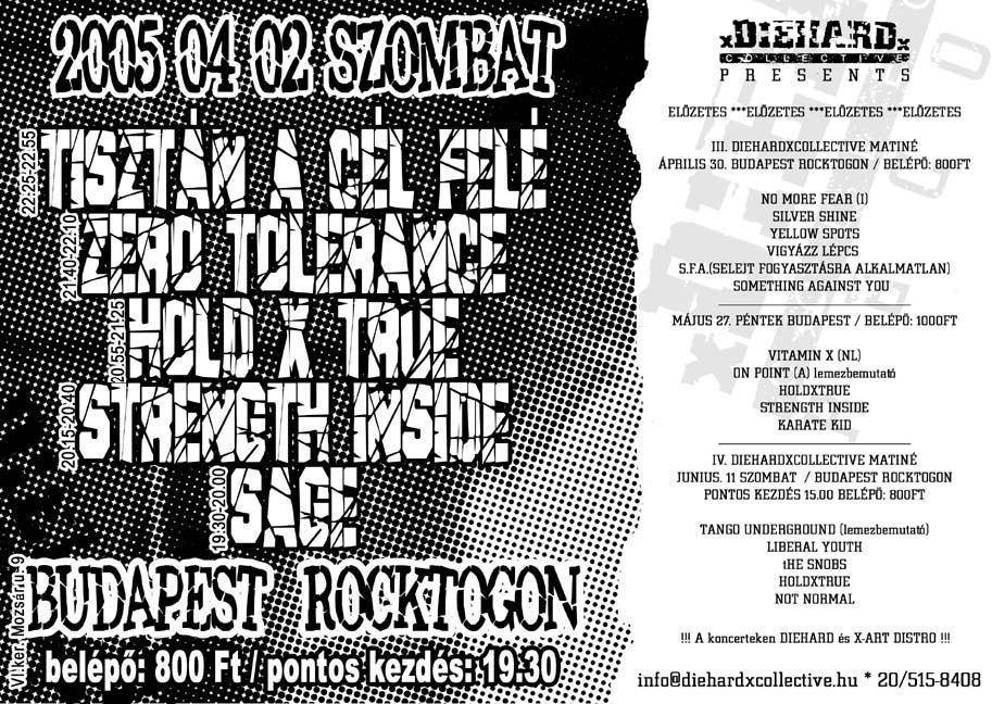 Április másodikán, szombaton a budapesti Rocktogonban fellépnek: Sage, Strength Inside, Hold X True, Zero Tolerance, Tisztán a Cél Felé. Beugró 800, kezdés 19:30-kor pontban. Részletek a szórólapon.