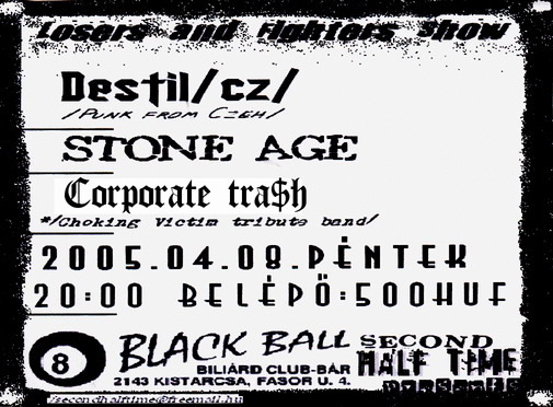 2005. április 8-án a kistarcsai Black Ball színpadán fellép a cseh Destyl, a Stone Age és a Másodosztály, Semmi Komoly és small fonts tagokból álló Corporate tra$h Choking Victim emlékzenekar. Beugró 500 Ft, kezdés 8-kor.
