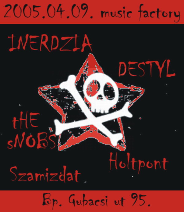 Április 9-én ismét Budapestre (Music Factory) látogat az olasz oi-punk banda, az Inerdzia és a cseh Destyl. Az estét a dark/punk Holtpont nyitja meg, őket követi a tHE sNOBS. Harmadiknak lép fel a cseh Destyl, akik nemrégiben a Semmi Komolyt látták vendégül. Zenéjük a tipikus cseh vonalhoz tartozik, amit az énekes produkciója tesz különlegessé (mp3). Éjfélkor kezd a négytagúvá terebélyesedő Inderdzia. Az estét a melodic punk zenét játszó Szamizdat zárja, repertoárjukban Wizo feldolgozással.